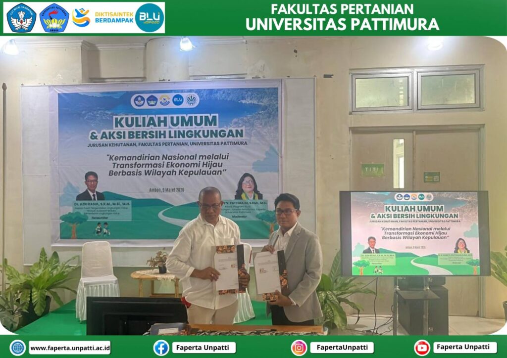 Ambon, 9 Maret 2026 – Jurusan Kehutanan Fakultas Pertanian Universitas Pattimura menyelenggarakan kegiatan kuliah umum yang dirangkaikan dengan aksi bersih lingkungan di lingkungan kampus. Kegiatan ini dipusatkan di Gedung dan Hall Jurusan Kehutanan serta diikuti oleh mahasiswa, dosen, dan civitas akademika.